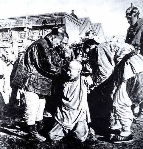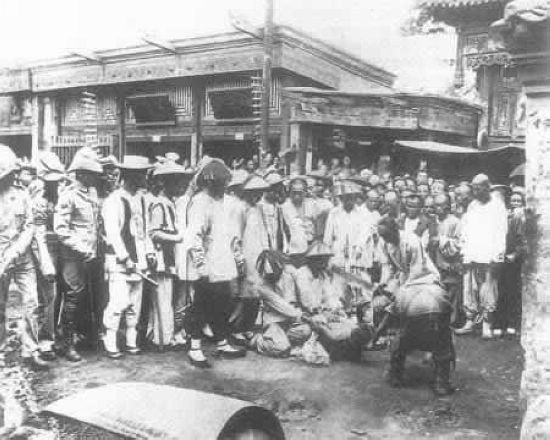 1901年2月21日,清廷明发上谕,加重惩治“首祸诸臣”,除令载勋自尽、毓贤正法外,加恩发往极边新疆,永远监禁。庄亲王载勋在蒲自尽。图为英军在北京菜市口监斩清廷官员。