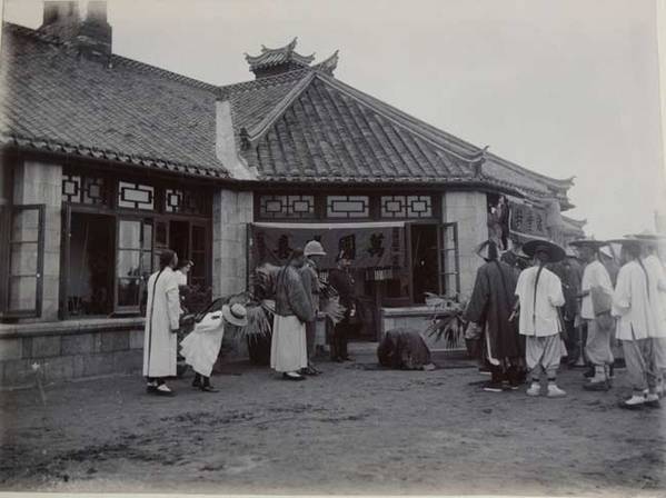 大清官员将锦旗挂在八国联军总部门口,双膝跪倒磕头,旗上写着“万国咸喜”。