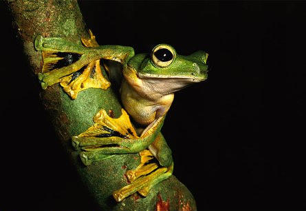 华莱士飞蛙(黑掌树蛙)是在马来西亚和印尼发现的,它们习惯生活在高高的树梢上。这种青蛙拥有带蹼的长脚趾,而且四肢之间有扁平的皮肤,它们利用这些东西,可以从树梢上降落下来。从某方面来说,术语“降落伞”就涉及到动物以很小的倾斜度从高处快速下降。虽然华莱士飞蛙喜欢生活在高处,但是它们必须下降到地面附近进行交配和产卵。这张照片是由提姆・拉曼拍摄的。