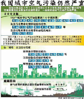 环保总局13日公布了2003年度国家环境保护重点城市环境管理和综合整治年度报告。报告显示,一些城市的空气污染仍然很严重。2003年,113个城市中空气污染最重的10个城市是:临汾、阳泉、大同、石嘴山、三门峡、金昌、石家庄、咸阳、株洲和洛阳。 年度报告还显示,部分环保重点城市的环保投资明显不足,基础设施相当薄弱。如长春、哈尔滨、武汉、湛江、北海、重庆、拉萨等城市生活污水集中处理率较低;哈尔滨、乌鲁木齐、贵阳的生活垃圾无害化处理比较低。 据统计,去年国家47个环境保护重点城市大气环境中可吸入颗粒物浓度年日均值、二氧化硫年日均值与2002年相比略有下降,可吸入颗粒物浓度有较明显降低的城市有北京、沈阳、南京、连云港、郑州、西安;二氧化硫浓度有明显降低的城市有太原、重庆、沈阳、南昌、宁波、长沙。在城市水环境治理方面取得了较大进步的城市有南京、杭州、宁波、厦门、南昌、郑州、西安。 环保总局副局长汪纪戎在通报年度报告结果时表示,2003年各重点城市在经济增长迅速的情况下,工业增加值的增长率普遍高于主要污染物排放量增长速度,总体上较上一年度呈不同程度的下降趋势。以“城考”分项指标考核,环境质量较好的城市有海口、珠海、湛江、桂林、北海等;污染控制完成较好的城市有南通、连云港、沈阳等;环境建设方面较好的城市有大连、烟台、深圳等。 据了解,环保总局1989年开始在全国重点城市实施的“城考”制度,是以量化城市环境质量、污染防治、基础设施建设和环境管理的指标体系,可综合评价一定时期内政府在城市环境综合整治方面工作的进展情况,从而实现了城市环境管理工作由定性管理向定量管理的转变。截至目前,参与城市环境综合整治定量考核的城市已达608个,占全国城市总数的91%。(完) 相关新闻:2003年最佳环境城市和最差环境城市排行榜 新华网北京7月13日电(记者李萱娜)中国国家环保总局13日公布了2003年最佳环境城市和最差环境城市的排行榜。 一份年度重点城市环境报告显示,环境质量最好的城市是海口、珠海、湛江、桂林、北海;污染控制最好的城市是南通、连云港、沈阳、苏州、福州;环境基础设施建设最好的城市是大连、烟台、深圳、珠海、海口。 而空气污染最重的10个城市是临汾、阳泉、大同、石嘴山、三门峡、金昌、石家庄、咸阳、株洲、洛阳。 中国目前共有668个城市,容纳36.1%的人口,贡献70%的国内生产总值和80%的税收。此次发布的环境报告包括了省会城市、直辖市、沿海开放城市、经济特区城市以及风景名胜城市等47个重点城市。 “在经济高速增长的情况下,47个重点城市的2003年的工业污染物单位增加值排放强度比2002年均有下降,而且污染增长速度小于工业增加值增长速度。”环保总局副局长汪纪戎在13日的发布会上说。 城市污染主要分为空气污染、水污染和噪音污染。报告显示,与2002年相比,2003年,47个重点城市的空气污染(包括可吸入颗粒物、二氧化硫浓度年日均值)略有下降;城市生活污水集中处理率、生活垃圾无害化处理率和危险废物集中处理率分别提高了10.68个百分点、1.78个百分点和12.06个百分点;环境噪声和交通干线噪声年均值略有下降。 此外,绿化覆盖率提高0.68个百分点,平均环保投资额增长0.14个百分点,达到GDP的2.43%。 汪纪戎说,尽管总体环境情况稳中有升,一些城市的空气污染仍然很严重。此外,由于机动车数量激增,北京、哈尔滨、南京、广州、西安、银川等城市二氧化氮年日均值浓度上升明显。 另外,部分城市的环境基础设施薄弱。2003年,生活污水集中处理率低的城市包括长春、哈尔滨、武汉、湛江、北海、重庆和拉萨;生活垃圾无害化处理率低的城市包括哈尔滨、乌鲁木齐和贵阳。 中国自1989年起开始实施一套包括城市环境质量、污染防治、基础设施建设和环境管理体系的城市环境综合整治定量考核体系。除了47个环境保护重点城市,还有561个城市参与考核,参与数量占全国城市总数的91%。(新华)