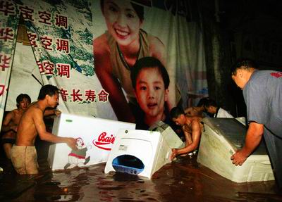 重庆开县的一条街道上,居民们正在从水中抢救家电。王桂江摄
