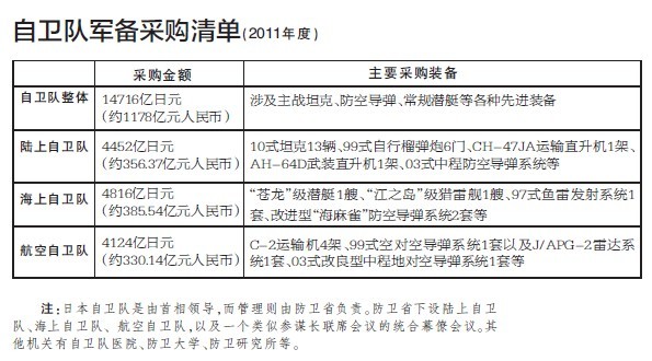 据日本媒体13日消息,日本右翼分子、东京都知事石原慎太郎在记者会上称,日本自卫队应该“常驻”钓鱼岛。日本政府日前决定修改相关法律,全面推进引入“集团自卫权”。而在日本防卫省网站上,公布的所谓自卫队2011年度装备采购清单显示,日本自卫队在2011年的军备采购费用总额为14716亿日元(约合1178亿元人民币),采购的装备涉及主战坦克、自行榴弹炮等各种先进装备。尽管有评论认为日本高额采购费显示日本武器的高昂价格,但透过这份名单,我们却需要警惕一个蠢蠢欲动的日本军国主义的松绑图谋。